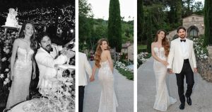 Durante la festa, Arianna ha sorpreso tutti con un secondo abito Pronovias Priveé, il modello Amya, adattato appositamente per l’occasione. Lo strascico originale è stato modificato e accorciato, trasformando il vestito in un’opzione più dinamica e festosa, perfetta per godersi la festa senza rinunciare a stile e comodità.