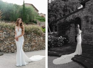 Il design, dalla silhouette a sirena, avvolge ogni curva prima di aprirsi maestosamente in un lungo strascico. Lo scollo a cuore valorizza il décolleté con un tocco romantico e sensuale, mentre la schiena in tulle trasparente con corsetto dona un’aria eterea e sofisticata. Come dettaglio finale, un drappeggio in raso cade a cascata lungo la schiena, aggiungendo fluidità e lucentezza.