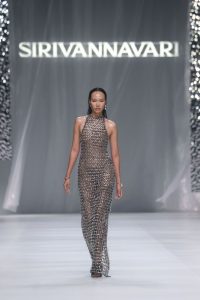 La modella britannica e Victoria’s Secret Angel, Leomie Anderson, ha incantato con uno spettacolare abito della collezione Primavera/Estate 2025 di SIRIVANNAVARI. Realizzato in un tessuto pregiato, l’abito valorizza la silhouette ed è impreziosito da cristalli scintillanti, perline metalliche e perline di vetro che brillano ad ogni passo.