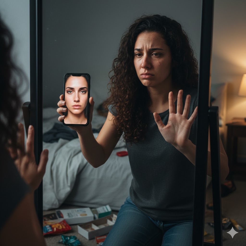 Comportamenti ossessivi: Il controllo compulsivo allo specchio, l’evitamento delle foto non ritoccate o la continua ricerca di angolazioni “vincenti” diventano rituali quotidiani.