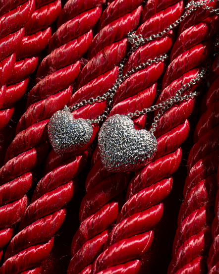 La collezione si focalizza su due icone della produzione di Coda. Il primo pendente, denominato “Baciami”, reinterpreta il gesto del bacio non come una semplice forma, ma come un incontro di volumi. Qui le corde d’argento si sovrappongono riproducendo il rilievo di labbra che si cercano, invitando chi lo indossa a riscoprire il valore del contatto fisico e della trasparenza emotiva. Il secondo pezzo, “Lègami nel cuore”, affronta invece il tema della connessione profonda. Il cuore, lontano dalle rappresentazioni banali, appare come un fitto intreccio di nodi sapientemente riprodotti in tridimensione. È l’immagine perfetta dei legami che, pur essendo complessi, costruiscono l’identità di ognuno di noi.