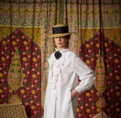 Le atmosfere evocative dei salotti georgiani di Jane Austen si fondono con le visioni cinematografiche di Autumn de Wilde, creando un ambiente onirico e contemporaneo. Il cotone damascato, i vasi neoclassici e le ghirlande floreali si trasformano in soprabiti, gilet e gonne che richiamano antichi templi e giardini immaginari.