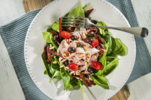 Infine, il terzo piatto, un’insalata di spinacino novello con straccetti di Prosciutto Cotto e profumi mediterranei, è pensato per chi cerca leggerezza senza rinunciare al gusto: la tenerezza dello spinacino novello, insieme alla dolcezza naturale del prosciutto cotto, alla croccantezza dei pinoli tostati e al sapore intenso delle olive taggiasche e dei pomodori essiccati, crea un’armonia unica di sapori tra loro contrastanti.