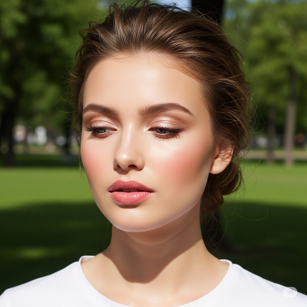 Colori naturali e vibranti: bronzer, mascara marrone, labbra matte per un look fresco ma deciso.