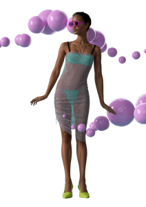 Le forme avvolgenti e drappeggiate si adattano al corpo con eleganza. Tessuti trasparenti, reti intrecciate e materiali luminosi richiamano l’incanto dei fondali marini. Le palette spaziano tra pink vividi e blu intensi, con effetti wet look che giocano tra lucentezze e opacità, creando atmosfere dinamiche e suggestive.